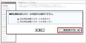 配信開始お知らせメールの初期設定は「受信する」となっておりますが、ご不要な場合は「配信開始お知らせメールを受信しない」へ設定変更をお願いいたします。