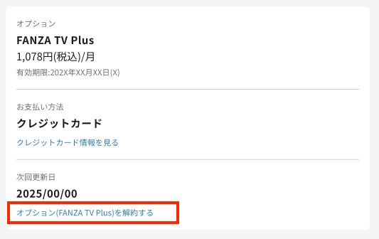 FANZA TV Plusの解約は、プレミアム利用状況ページの「オプション(FANZA TV Plus)を解約する」から行えます。