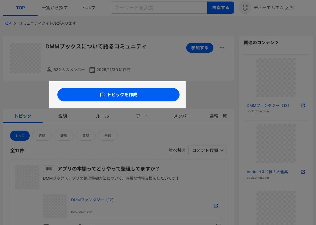 TOP > コミュニティトップ > トピックを作成ボタンを押す