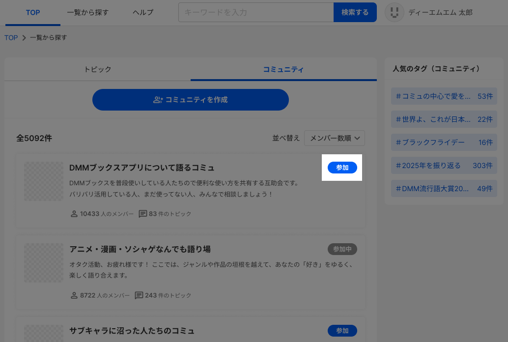 誰でもコミュニティに参加することができますか?ログイン後、フォーラムにて初回登録がお済みの方であれば、どなたでも参加できます。その他コミュニティの参加に条件はございません。コミュニティ参加方法TOP > コミュニティ一覧画面TOP > コミュニティ詳細画面最近の閲覧数: 2コミュニティについてヘルプに戻る