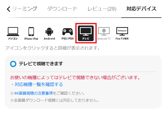 対応デバイスに下記アイコンが表示されている作品は、DMM.comまたは、DMM TVアプリで視聴できます。