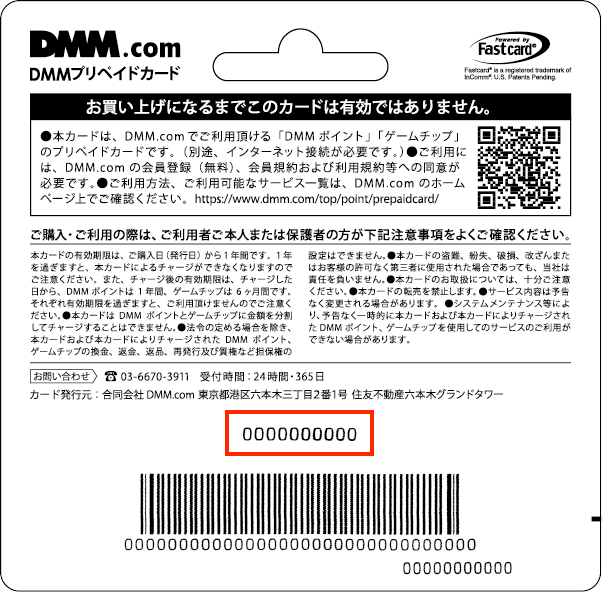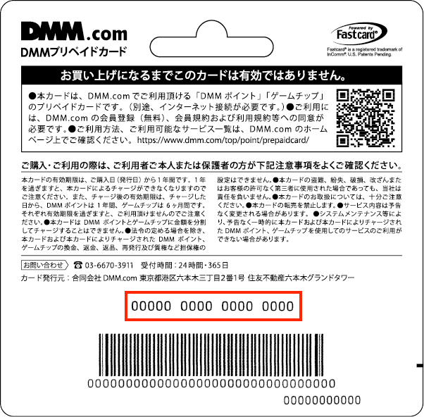 カード裏面のプリペイドカード番号を入力することで、DMMポイントまたはゲームチップにチャージできます。